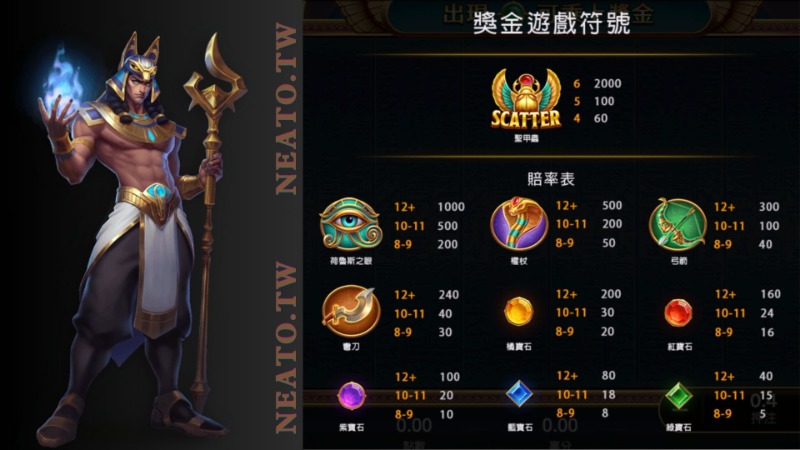 戰神賽特除了一般的老虎機玩法外,還有特殊功能,包括Scatters(聖甲蟲)、JACKPOT符號和其他特殊符號。了解這些符號的出現條件和使用方法可以提高你的中獎機會。